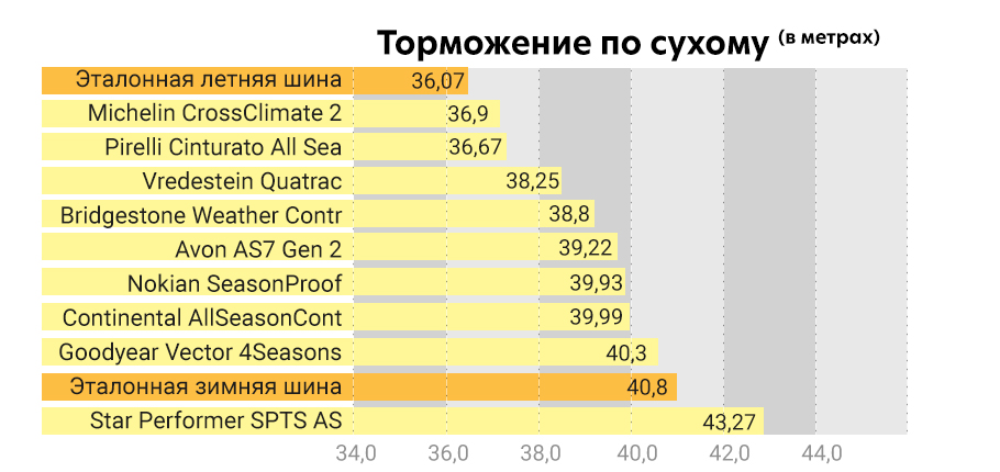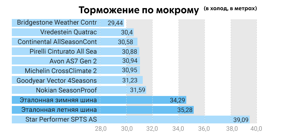 - Самый короткий тормозной путь на мокром покрытии при теплой температуре